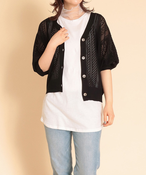 夏らしい透け感が出るよう、縦ラインの柄があしらわれたカーディガン。 ショート丈なのでワンピースなどと合わせるとスタイルアップしてくれます。 裾の太めリブのデザインはウエストラインを強調してくれて、着痩せ効果も◎ タンクトップ×デニムパンツなどのコーディネートにさらっと羽織っていただいてもサマになるアイテムです♪
