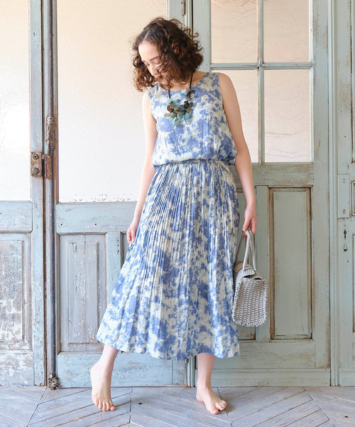 今年流行りのタイダイ柄を全面にあしらったプリーツワンピース。 ウエスト下のプリーツがボリューム感と動きを演出。 見ているだけで涼しい気分になるワンピースです 首元はすっきりとしたデザインなので、ネックレスなどを引き立ててくれます。 少し肌寒くなってきた時期には、カーディガンなどと合わせたスタイリングも◎