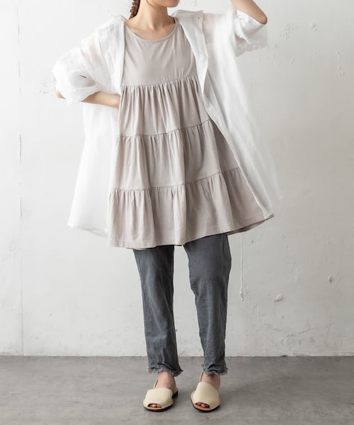 ピュアルセシン 2021 Spring collection 【with a Breeze】 新しい価値観の生活の中でこそ、ピュアルらしさのモノづくりの持続とその中にも、エフォートレスな気分、「with a Breeze」風をまとい、丁寧な暮らしに寄り添える、洗練されたスタイリングの提案 ◇エアリーなティアードチュニック◇段々のティアードデザインがかわいいチュニック。カットソー素材でデザインされているので、広がり過ぎず程よいボリュームに。生地に落ち感があり、動くたびにゆらゆら。 エアリーな雰囲気で涼しげです。シャツやカーディガンと合わせて、昨年も人気だったノースリーブタイプ。ティアードは羽織の中でもしっかり映えるデザインですよ。日焼けしたく無いけれど暑い。これからの夏の日々に、気温調整のしやすいアイテムです。・ティアードの段々がかわいい・カットソーなので程よいボリューム・エアリーな雰囲気で涼しげ・羽織りの中でも見栄えがいい・褪せた優しい色展開が夏らしい=============================透け感:シロややあり裏地:なし伸縮性:あり光沢感:なし生地の厚さ:薄め【スタッフコメント】年齢:30代後半/身長:154cm/普段着用サイズ:Mサイズサイズ感:胸あたりからティアードでギャザーが入りゆとりがあります。素材感:薄手で柔らかい=============================※撮影場所やお使いのモニター環境により若干お色味が異なる場合がございます。特にロケの撮影では明るく見える傾向にございます。※予約商品はサンプルで撮影をしております。若干の仕様が変更になる場合がございますので予めご了承の上ご注文くださいますようお願いいたします。
