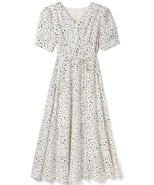 ガーリーな気分を盛り上げるダルメシアン柄のワンピース。 パフスリーブが女性らしい印象に見せつつ、細見せを叶えてくれる。 リボンのウエストマークで、さりげなくスタイルアップも可能。 バスト下とウエストの切り替えが腰高に見せる。 ★裁断の関係で、柄の出方が写真と多少異なる場合があります。 ★裏地付きです。
