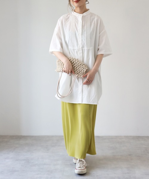 ★旬顔ピンタックシャツ★ 《スタイリング》 丈長めでお尻まで隠れます。細いパンツなどと合わせても◎ トレンドのカラーパンツ、デニム、柄パンツなどなににでも相性抜群! 《ポイント》 今年らしいピンタックのトレンドアイテム。 シンプルの中にも華やかさのあるデザインです。 オーバーサイズで肩落ちデザインで後ろもタックが入っています。