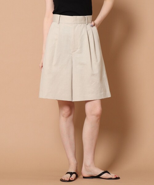【丈感や素材にこだわった上品な大人のショートパンツ】【デザイン】タックでふんわりと広がるシルエットのショートパンツ。大人の女性も着やすい長め丈です。上品な光沢とハリがある素材で、綺麗めに仕立てているので、上品に着られます。【生地感】コットン(綿)とフレンチリネンを高密度で織り上げたツイルを使用しています。上品な光沢とハリがあります。夏場でも肌に張り付かず、さらりとした肌触りです。【着こなし・スタイリングのおすすめなど】オーバーサイズのシャツなど、メンズライクなアイテムとのスタイリングがおすすめです。足元は抜け感のあるフラットサンダルが〇※ポケット数:横×2、後ろ×2※裏地なし※ナチュラル(050)はやや透け感があるため、インナーの着用をおすすめします。こちらの商品は主に夏に着用いただける商品です。モデル情報:身長166cm B80 W59 H86 着用サイズ:38(M)店舗へのお問い合わせ商品番号:085-62081●製品寸法:34(SS):W66cm H90cm 股下22cm 前股上34cm 渡り幅36cm 裾幅38cm36(S):W67cm H93cm 股下22cm 前股上34cm 渡り幅37cm 裾幅39cm38(M):W69cm H96cm 股下23cm 前股上35cm 渡り幅38cm 裾幅40cm備考: