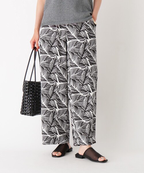 ムードのあるリーフ柄が印象的なイージーパンツ【デザイン】スイリングの印象を一気に変える、インパクトのある柄がポイントのイージーパンツです。ウエスト周りはゴム仕様。ややワイドなシルエットで、非常にリラックスした履き心地がポイントです。ウエストにはドローコードを入れているので、絞ってウエスト位置の調整が可能です。インパクトのあるリーフ柄は、ダークなトーンでまとめることで存在感がありながら大人っぽい印象に。Tシャツなどに合わせるだけで一気にムードのあるスタイルが叶います。ご家庭でのお洗濯が可能なイージーケア性もうれしいポイントです。※裏地なし※ポケット数:横×2※WEB限定サイズ:42(LL)こちらの商品は主に夏に着用いただける商品です。モデル情報:身長165cm B72 W57 H84 着用サイズ:38(M)店舗へのお問い合わせ商品番号:637-62024●製品寸法:38(M):W~78cm H96cm 股下66cm 前股上33cm 渡り幅34cm 裾幅28cm40(L):W~80cm H98cm 股下67cm 前股上33cm 渡り幅35cm 裾幅29cm42(LL):W~82cm H100cm 股下68cm 前股上34cm 渡り幅37cm 裾幅30cm備考:
