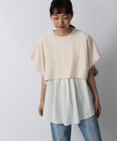 人気のニット&インナーの2Pが夏も登場!ショート丈ニットとノースリーブブラウスのセットアイテム。ニットは中心と脇で丈を変えているため、着用するとこなれた雰囲気に。インナーのブラウスは身頃にタックが入っていて程よく広がるシルエットが女性らしい印象にしてくれる1枚です。セットでも別々でも使っていただける便利なアイテムです。セットで着用する際は、ボトムスはフレアパンツやデニムなどのベーシックなアイテムがおすすめです。