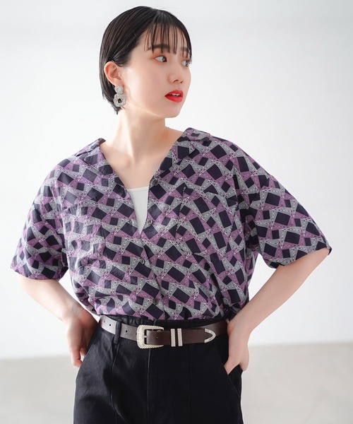 オリジナルプリントのオープンカラーシャツドライタッチな質感の涼しげな素材を使用しています。パンツでもスカートでも合わせやすい丈とサイズ感です。ブラックベースのエスニック柄がクールな印象で、夏のモードカジュアルな着こなしにぴったりな1枚です。※モニター・環境等により実際の商品と色味が多少異なって表示される場合がございます。予めご了承をお願いいたします。※撮影環境により、光の当たり具合で色味が違って見える場合があります。あらかじめご了承下さい。