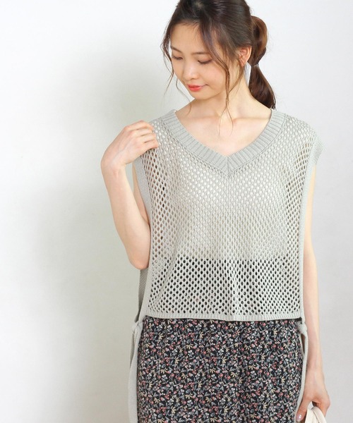 トレンドのメッシュ編みを使用したニットベスト。サイドのリボンがポイントになり、女性らしい印象にしてくれます。短めの丈感でバランスを取りやすいのも魅力的。シアーシャツやワンピ―スとのレイヤードスタイルにおすすめの1枚。合わせるアイテムによって印象が変わる万能アイテムです。Vネックデザインで顔周りをすっきりと見せてくれます。サイドリボンでウエストのサイズ調節ができるのも嬉しいポイントです。透け感のあるメッシュ素材。伸縮性があり快適な着心地です。- - - - - - - - - - - - - - - - - - - - - - - - - - - - - - - - - 透け感:あり裏地:なし伸縮性:あり光沢感:なし- - - - - - - - - - - - - - - - - - - - - - - - - - - - - - - - - ※ 撮影時の照明などの環境と、モニターに表示される色味がメーカーにより変わってしまう等の理由により、実際にお届けする商品と、ご覧になられているアイテムの色が若干異なる場合がございます。ご了承下さいませ。