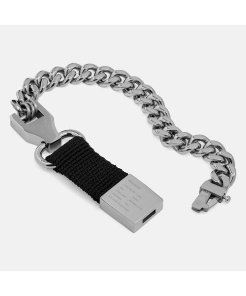 いくつかの隣接するパーツで構成されたこの工業用ブレスレットは、ナイロンストラップと、ステンレス鋼の技術的特性がレーザー彫刻された平らな正方形の留め金で構成されています。 材質:ステンレススチール