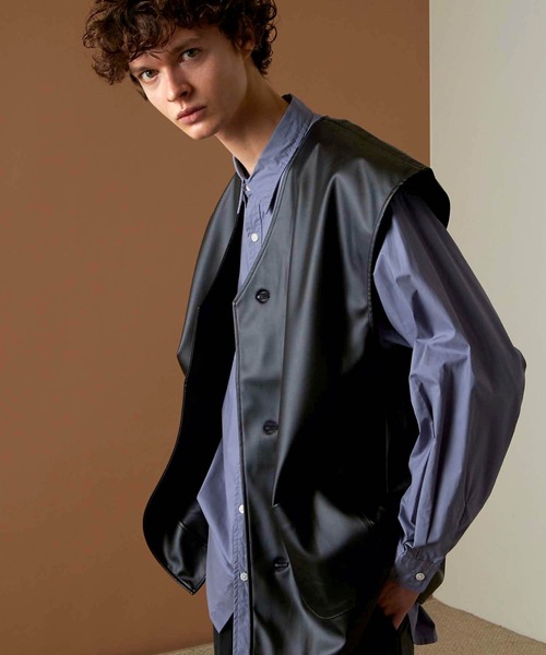 素材のよさを素直に生かす 釣り合うわずかな重みを加算させる 【ファブリック】 本革に引けを取らない質感で高級感のある今シーズン、注目度の高いトレンドなシンセティックレザー(フェイクレザー)を採用し仕上げたアイテムです。 上品な光沢感を備え、ストレッチ性にも長け、柔らかくしなやかなでイージーケアー性に優れたファブリック。 本革と同様にオーセンティックな雰囲気をもちつつ、軽快な着用感をお楽しみ頂けます。 【ディテール】 フロント前立てはスッキリとした印象の比翼仕立て。スナップ釦のですっきりと見せることで大人のスマートな上品さを実現しました。 また、顔周りをシャープに印象付けてくれるVネックのディテールが甘くなりすぎない大人のレイヤードスタイルを演出。 スタイリングを飾るスパイスとしてぜひ、おすすめしたいアイテム。 【シルエット】 身幅やアームホールなどにややゆとりを持たせたトレンド感のあるなオーバーサイズシルエット。 抜け感がありながらも上品に纏められたフォルムにより、1ランク上のゆったりとした佇まいを確立しました。 あらゆるシャツ、カットソーアイテムと相性が良く、また、スキニーパンツからワイドパンツまで合わせるボトムを選ばず、お気に入りのレイヤードスタイルが完成します。 EMMA CLOTHES(エマ クローズ): 都会的で洗練されたウェアを基調とし、伝統的なデザインや魅力的な着こなしの提案など、 現代に合った理想のバランスを追求するコンテンポラリーブランド。 これからの新たなヴィジョンとして、「今」に落とし込んだ形を作り出し、進化と発展をしていきます。