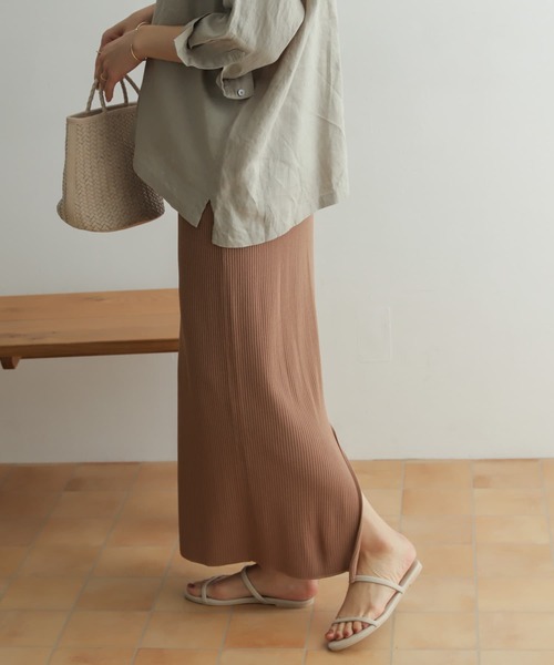 フィット感のあるタイトシルエットのスカートは、ニットならではの履き心地や女性らしいライン、立体的なリブ生地がコーディネートに表情を与えてくれるアイテム。しっかりと長さを採った着丈やバックスリットもスッキリとした印象で、スニーカーにはもちろん、サンダル合わせでもラフすぎずに合わせていただけます。ドライな生地感が心地良く、気温が上がってからでもストレスのない着用感を提供。ヒップラインが出すぎないよう腰回りのサイズ感にこだわっているため、タイトが苦手な方にも取り入れやすくなっています。-----------------------------《スタッフ着用コメント》[スタッフA]年齢 : 30代前半, 身長 : 158cm, 体型 : 普通普段の着用サイズ : M ボトムスはSパーソナルカラー : ブルーベース 夏タイプ【着用カラー/サイズ】L.BEIGE/one【サイズ感】スカートは総ゴムでウエストはリボン調整ができるのですが、ぎゅっと絞ってもやや緩めでした。トップスインすると丁度良かったです。足首がしっかりと隠れる長さなのですが、ウエストを一つ折ってもシルエットが変わらなかったので小柄な方にもおすすめです。【素材感, 着心地】レーヨンとナイロンの混合生地なのですごくさらっとした肌触りでで暑くなく、着心地もすごくいいです。バックスリットも入っているのでタイトながらも歩きやすく、足のラインをきれいに見せてくれます。【その他】ワントーンコーデや淡いくすみカラーのトップスと合わせたくてこちらにしました。オールシーズン着れるのも嬉しいです。[スタッフC]年齢 : 20代前半, 身長 : 168cm, 体型 : 細身普段の着用サイズ : M ボトムスはMパーソナルカラー : ブルーベース 冬タイプ【着用カラー/サイズ】L.BEIGE/one【サイズ感】サイズ感は丁度です。丈の長さは私の身長で足首まであります。高身長の方でロングスカートを探されている方にはとてもおすすめです。【素材感, 着心地】とてもフィット感のあるスカートです。透け感もなく、安心して履くことができます。【その他】トップスにカラー物を持ってきやすいベージュカラーにしました。カラーと合わせるのが楽しみです。[スタッフD]年齢 : 30代後半, 身長 : 163cm, 体型 : 普通 骨格しっかり普段の着用サイズ : Mパーソナルカラー : ブルーベース 冬タイプ【着用カラー/サイズ】MOCHA【サイズ感】腰回りがしっかりしているわたしでもラインが出にくいサイズ感です。丈は足首くらいです。背の低い方はウエストを折ってもデザインに支障はなさそうです【素材感, 着心地】凹凸のある生地はシャリっとしていて、ソフトでかなり楽な履き心地です。締め付けも全くありません。逆にゆるい場合も紐があるので落ちたりはしないと思います。透け感も同色系の下着であれば気になりません。【その他】マイルドなモカ色なのでコーディネートしやすいです。-----------------------------※この商品は素材の特性上、長時間日光に当たったり、汗・水・摩擦等により色落ち・色移りをする恐れがありますので、ご着用・洗濯などの際は、充分にご注意ください。※素材の特性上、着用の際ピリング(毛玉)が発生する場合があります。ピリングは引っ張って取ろうとせず、小さなハサミなどで丁寧に取り除いて下さい。※その他お取り扱いに関しましては、商品に付属のアテンションタグをご覧ください。※商品画像は、光の当たり具合やパソコンなどの閲覧環境により、実際の色味と異なって見える場合がございます。予めご了承ください。※商品の色味の目安は、商品単体の画像をご参照ください。▼お気に入り登録のおすすめ▼お気に入り登録商品は、マイページにて現在の価格情報や在庫状況の確認が可能です。お買い物リストの管理に是非ご利用下さい。-----------------------------透け感:なし伸縮性:あり裏地:なし光沢:なしポケット:なし-----------------------------
