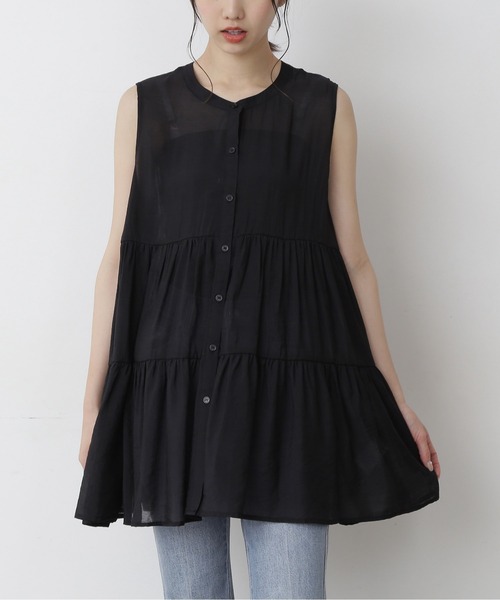 清涼感のあるノースリーブチュニックブラウス。シャリ味のあるシアー素材を使用し、夏にぴったりな風合いです。 ネックラインはすっきりと、身頃はシンプルなティアードデザインが可愛らしいポイントに。 お尻が隠れるチュニック丈なので、フレアパンツとのコーディネートがオススメです。
