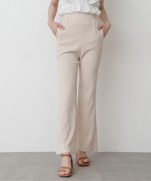 ワッシャー感のある先染めギンガム生地を使用した、夏にぴったりなフレアパンツ。程よいゆとりとフィット感が心地いいフレアシルエットで、脚のラインをすっきりと見せてくれるデザインです。 バックスタイルにスリットを入れ、足元に抜け感をプラスしました。ウエストはゴム仕様で着用感も楽です。 シンプルなチュニックブラウス、カジュアルなTシャツとも着まわしできます。 ※膝丈まで裏地付き ※こちらの商品はSサイズの展開がございます。 ◆サイズ目安◆ Sサイズ→身長153cm~156cm ウエスト60cm~62cm ●商品特性● 〇透け感:なし 〇生地の厚さ:薄手 〇裏地:あり 〇伸縮性:あり 〇光沢:なし 〇シルエット:スタンダード 〇インフォメーション〇 ★商品のお気に入り登録 登録すると、完売しても再入荷時に通知を受け取ることができます。 ほかにもお得な特典があるかもしれません♪ ★ブランドのお気に入り登録 新商品や再入荷などの情報を受け取ることができますので、是非ご登録ください♪