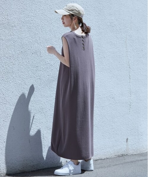 【デザイン・シルエット】肩にタックを入れて後ろに立体感が出るように仕上げたニットワンピースです。しっかりとした総針の編み地を使用し、きれいなAラインに広がるシルエットに仕上げました。後ろの衿のところに小さめのメタル釦を使ってキラッとしたポイントを入れています。体のラインを拾いにくく、透けにくい編み地にしているので、ワンピース一枚でさらっと着ていただけます。【素材】透けにくくしっかりとした総針の編み地のニット素材。【カラー】大人カジュアルにぴったりな4色展開。