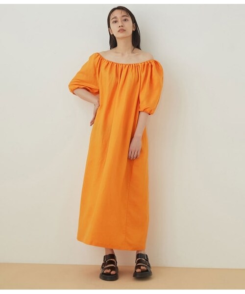 【Material】ハリ感と程よい厚みのあるリネンを使用。袖や肩部分のボリュームがしっかりと出ます。【Design】オフショルダーでも着て頂ける2WAYタイプのマキシワンピース。着丈をくるぶし為まで長くしたアダムエロペ別注のシルエットで、一枚でコーディネートが決まるリラクシーなワンピースです。【Color】鮮やかで夏らしいオレンジのカラーです。【Stylingpoint】可愛らしいデザインなので足元にはボリュームのあるサンダルなどの合わせもおすすめです。