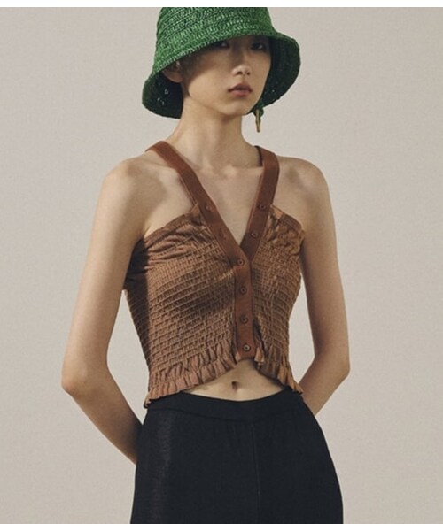 【Material】伸縮性のあるシャーリング素材と、伸びの良いリブがコンピになったベストです。【Design】程よく身体にフィットしてくれるため1枚着としても、薄手のインナーとレイヤードしてもかわいいデザイン。異素材のコンビのためシンプルながらもスタイリングのポイントになってくれます。【Color】BROWNとNAVYの2色です。【Stylingpoint】ショート丈のためハイウエストのボトムと合わせるとバランス良く着て頂けます。カットソーやワンピースの上に