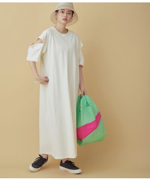 ◇2021春夏◇ADAM ET ROPE' FEMME【Material】程よい厚みがあり、1枚で着ても透けが気になりにくい天竺素材を使用。加工により、やわらかさとこなれた風合いのある素材感が魅力。【Design】袖のカッティングが特徴の、ヘルシーな肌魅せが叶うワンピース。袖に自然とニュアンスが出るので、シンプルながらもディティールが映えるのが魅力。【Color】こなれ感のあるニュアンスのオフホワイトと、淡いトーンのマスタードの2色展開。【Styling p