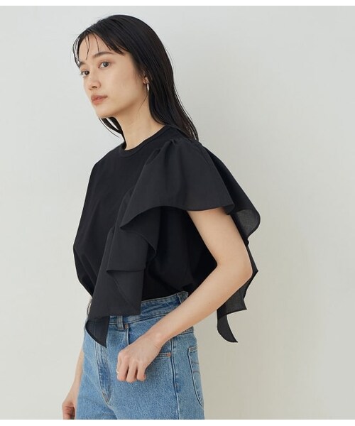 ◇2021春夏◇ADAM ET ROPE' FEMME【Material】カットソー部分:厳しい条件をクリアしたオーガニックコットン100%の天竺を使用。上品かつ美しい表面感のしっかりとした天竺素材が魅力。袖布帛部分:キメが細かく透け感が抑えられたソフトな肌ざわりが特徴の、軽く膨らみのあるローン素材を使用。【Design】袖丈のバランスにこだわって仕上げた、アシンメトリーデザインのプルオーバー。フレアスリーブ部分にギャザーをたっぷりと入れ、ランダムなカットで動きを持たせたこ