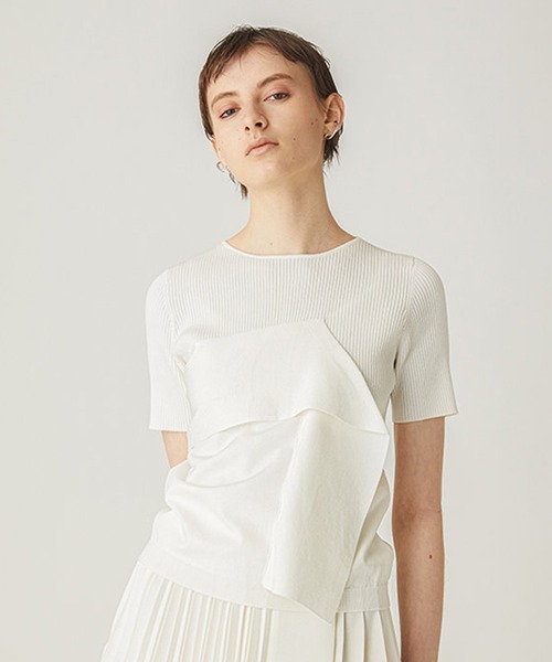 【CAST:キャストコロン 2021年春夏アイテム】 【Design】 フロント部分のデザインがシャープな印象のデザインニット。 直線的な切替デザインが全体を引き締めています。 身頃部分は上部分と下部分で編地の種類を切り替えていて、さらにバンドデザインを付けているので、他にはない立体的なニットトップスに仕上がっています。 【Fabric】 肌にまとわりつかないさらりとした快適な着心地感が特徴のストレッチヤーン素材です。 深みのある落ち着いた色彩になり、肌なじみの良い色が特徴です。 レーヨンとナイロンの撚糸を撚り合わせたもので1本の糸が構成されており、強撚特有の清涼感と繊細な表情感のある素材です。 【Styling】 シンプルながらフロントデザインがアクセントになるデザイントップスです。 ※この商品はサンプルでの撮影を行っています。 実際の商品とイメージ、サイズ、品質表示、原産国等が異なる場合がございます。 ※店頭及び屋外での撮影画像は、光の当たり具合で色味が違って見える場合があります。商品の色味は、スタジオ撮影の画像をご参照ください。