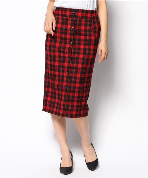 フロントボタンでアクセントを添えたオーバーチェックスカート。膝の隠れる丈感とペンシルシルエットですっきりとまとめたシルエットが、トラッドライクなこなれ感を演出します。アンサンブル合わせはもちろん、テーラードジャケットなどを羽織ってもプレッピーな着こなしが楽しめておすすめです。 model グリーン系その他 H160 B82 W62 H87 着用サイズ:MEDIUM ブラック×レッド H160 B82 W62 H87 着用サイズ:SMALL