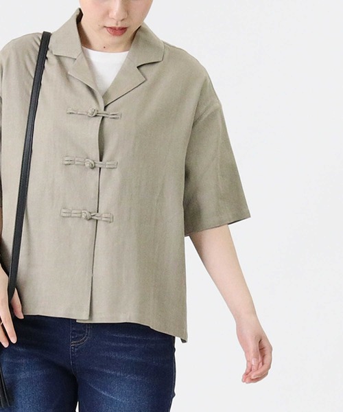 トレンドのチャイナボタンがポイントの半袖シャツ。ゆったりとしたシルエットで着こなしやすく、どんなボトムともコーディネートがしやすいです。前を開けて羽織りとしても活用できます。