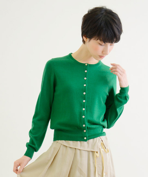 羊毛の中でも最高級とされるメリノ種を使用したクルーネックカーディガン。高い保湿性と収縮性、適度な吸湿性、型崩れしにくい性質を持っています。カジュアルにもキレイめにも着回ししやすいシンプルなデザインです。着丈が短いのでロングスカートや、ワンピース、フレアスカートとの組合わせもオススメです。 *毛玉や毛羽立ちにご注意下さい。 *洗い不可。ドライクリーニング可。 [グリー]身長:H168 B79 W57 H84 メーカー品番:MLK4509032