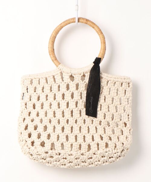 大人可愛い!トレンドのマクラメ編みバッグ マクラメ編みにラタンの丸ハンドルがポイントのナチュラルなデザインのバッグ。 ラタンのハンドルは軽くて持ちやすく、使いやすさ抜群です。 編み目の透け感が涼しげで軽い印象でありながら、持ち手のリボンがレディライクなアクセントに!