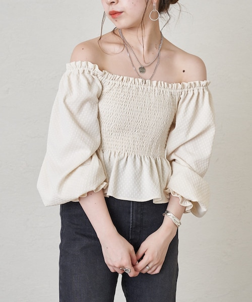 【デザイン】肩にゴムが入っているのでそのままの首元でもオフショルでも2wayでお召し頂けます。半端袖丈なので露出感が苦手な方でもお召し頂きやすく長い季節着回し頂けるようになっています。袖口にはゴムが入っているので止める位置を変えるとボリューム袖を楽しみやすくなります。これからの季節も過ごしやすいさらっとした素材でぽこぽことした生地感が可愛いブラウスです。【コーディネート】甘見えするブラウスなのでロングパンツでカジュアルダウンすると今年らしいバランスが完成します。裾は少しふんわり広がるデザインなのでボトムスにはタックインせず出して着るのがブラウスを綺麗な形で着て頂けるポイントです。首元がすっきりと開くデザインなのでネックレスをプラスすると華やかな印象でお召し頂く事が出来ます。▼お気に入り登録のおすすめ【気になるアイテムを登録】ハートをクリックしてお気に入りに登録すると完売カラーの再入荷やラスト1点の通知、セールの通知を受けとることができます。【ブランドを登録】新商品や再入荷、セール通知など、いち早くブランドの情報を受けとることができます。是非ご利用頂き、お買い物をお楽しみ下さい。▼商品について・サイト上のカラー名と、お届け商品に記載されているカラー名が異なる場合がございます。・商品の色味は、撮影場所や光のあたり具合などにより色味が違って見える場合がございます 。また、お客様のお使いのPCのモニター環境などにより色味が違って見える場合がございます。予めご了承の上ご注文下さい。▼返品・キャンセルについて・着用、洗濯後の返品は致かねます。・商品到着後、着用前に商品を確認して頂きますようお願い致します。chico210507