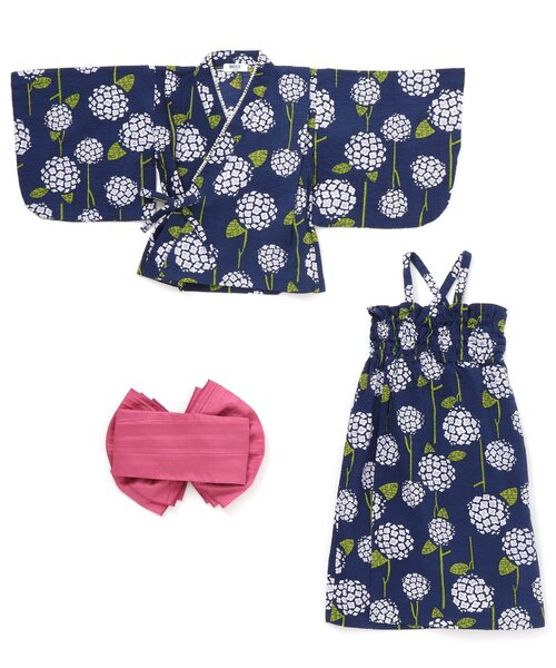 【浴衣としてもワンピースとしても楽しめる、BREEZEの2WAY浴衣♪】 大きなアジサイ柄がかわいい♪ 帯がリボン型になっているのもポイント♪ セパレートタイプなのでワンピースとしても着られて、お祭りなどの行事以外でもご着用いただけます☆ 姉妹やお友だちとお揃いで夏を楽しんでくださいね!