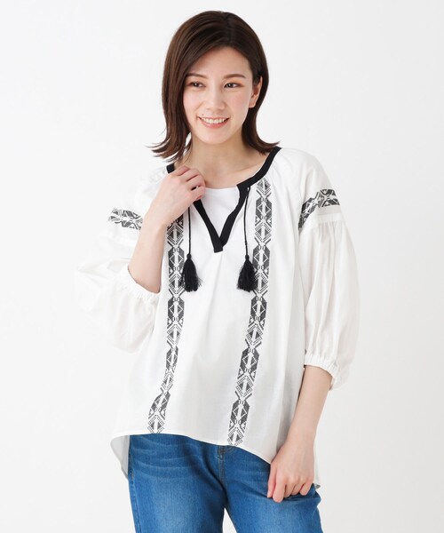 【デザイン】スタイリングに華やかさを加えてくれるカフタン刺繍ブラウス。フロントだけではなく、袖口にも刺繍を入れています。パイピングやタッセルで引き締めて、リラックスシルエットですがすっきりした印象になります。シンプルになりがちな、初夏~盛夏スタイルのアクセントになるオススメの1枚です。【生地感】夏に快適なさらりとしたコットンリネンを使用しています。※こちらの商品はやや透け感があるため、インナーの着用をおすすめします。こちらの商品は主に夏に着用いただける商品です。モデル情報:身長167cm B78 W62 H88 着用サイズ:02(M)店舗へのお問い合わせ商品番号:C62-82062●製品寸法:00(FREE):着丈68cm B104cm 裄丈65cm備考: