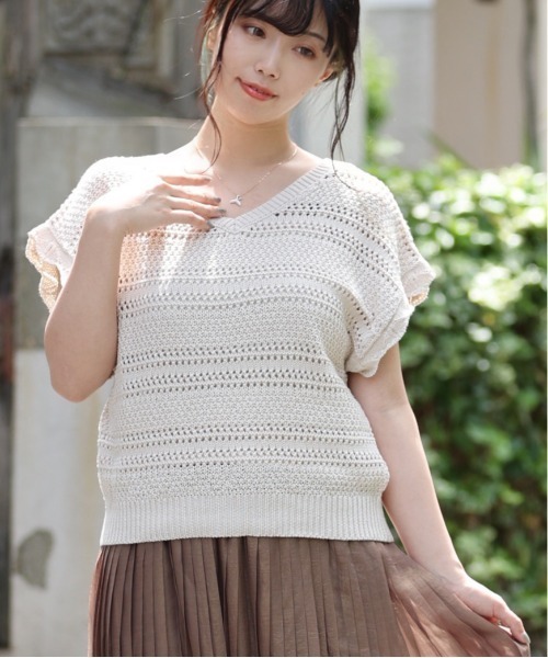キャミソール付きフレンチスリーブ透かし編みニット 程よい透け感が女性らしさを演出し、レイヤード可能なサマーニット。 同色のキャミソールもセットになっているので組み合わせて着るだけでなく、透け感のあるブラウスやシャツのインナーとして、ニットはロンTやワンピースにレイヤードするなど着回し出来るアイテム。 前後Vネックになっていて胸元を綺麗に魅せてくれます。背中はレースになっていてぎゅーっと絞るとシルエットの変化が楽しめます。ネックレスやバングルなどのアクセサリーを合わせることでより垢抜けた印象に仕上げてくれる今期トレンドアイテムのメッシュニット。 インナーサイズ 着丈 50㎝ 身幅 39㎝ ■着用モデル/164cm ■サイズ/F *****ブランド紹介***** 2020年秋冬より始動のブランド『ARCANUM DESIGN』アルカナムデザイン。 ARCANUM…秘密・奥義 ブランド名由来通り、独特なアイデア、デザイン、ディテール、素材を商品に落とし込む。 また小柄な女性(低身長)にもサイズ対応するアイテムもあり、多くの方に愛用して頂ければと思っています。 【JACKROSE 快適お買い物ガイド】 ★最短で翌日お届け商品をカートに入れた後、注文内容の確認ページで「即日配送」を選択していただれば、最短でご注文した翌日にお届け致します。 ★商品のお気に入り登録完売カラーの再入荷通知や、ラスト1点の通知、セールの通知をお知らせします。 ★ブランドのお気に入り登録新商品や再入荷など、いち早くJACKROSEのお得な情報を受け取ることができます。