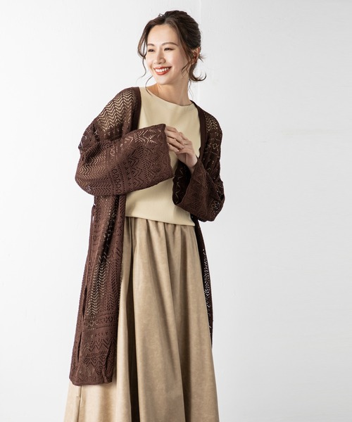 【Revival Item】 昨年の人気アイテムが再登場! ベーシックで合わせやすく、さらりと羽織ればワンランク上の大人スタイルへ【デザイン】クロシェ編みから覗く肌見せでシーズンムードを高めるロングカーディガン。シャリ感のある糸を採用し、リラクシーな着心地を実現。繊細に織り成された柄がシンプルな中に程良い存在感を演出します。袖はゆったりと長めに設計され手元から女性らしさを導き、付属のウエストリボンの絞り具合でお好みのシルエットに調節できます。コーディネートに馴染みやすいカラー展開も魅力で、ロングシーズンで楽しめるアイテムです。【MODELサイズ】■ブラック | MODEL(メイン画像):身長 172cm / B83cm / W59cm / H87cm■ベージュ | MODEL(メイン画像):身長 172cm / B83cm / W59cm / H87cm■ブラウン | MODEL(メイン画像):身長 172cm / B83cm / W59cm / H87cm■カーキ | MODEL(メイン画像):身長 172cm / B83cm / W59cm / H87cm【MODEL着用サイズ】Fサイズ