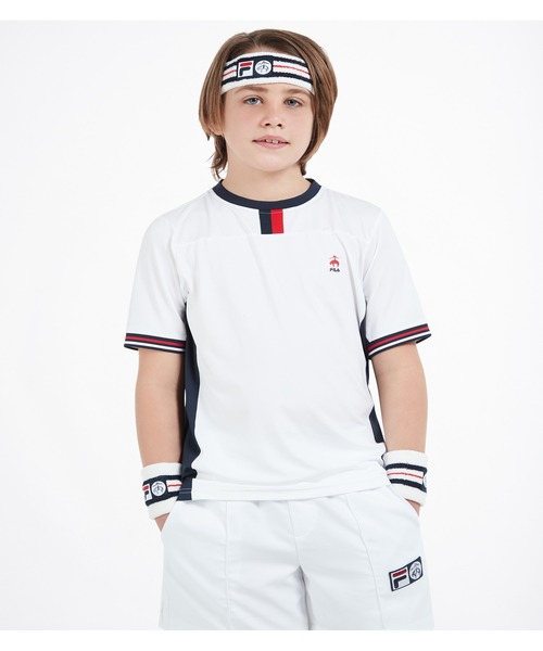 【Brooks Brothers x FILA Collection】(BOYS商品) Brooks Brotherのクラシックなアメリカンファッションと、FILAの象徴であるテニスの伝統を融合したコレクション 共通のシグネチャーカラーのネイビーxレッドxホワイトを用い、スポーティーでスタイリッシュなカジュアルウェアと小物を提供します。 ストレッチの効いたポリエステルのジャージー素材を用いた半袖Tシャツ ホワイトとネイビーのブロック使い、ネックにはFILAのシグネチャーストライプのテープを施しました。左胸にBBxFILAロゴのプリント入りです。 メンズ商品も販売していますので、親子おそろいで着用できます。