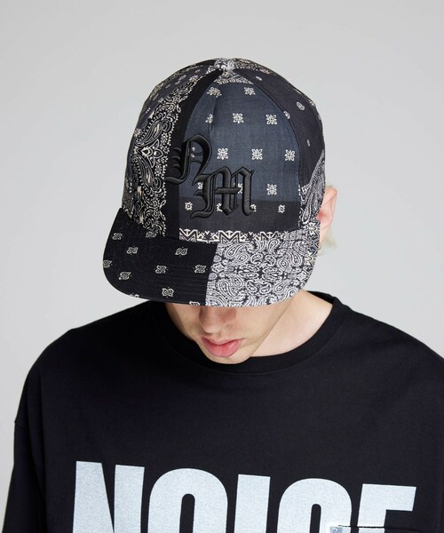 バンダナ柄のオリジナルキャップ パッチワークを模したプリント生地を使用したバンダナ柄のキャップ。 フロントにはN.M(NOISEMAKER)を意味する刺繍を入れました。 ※こちらの商品は日本製(メイドインジャパン)となっております。