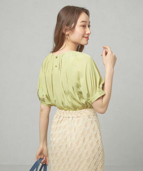 上品な光沢感が魅力のポリエステルサテン生地でお作りしたショートスリーブブラウス。襟元や袖口にたっぷりとったギャザーが作り出すエレガントなフォルムが魅力です。フェミニンな表情のパフスリーブやふわっと広がるシルエット、華奢なゴールドボタン使いが女性らしさを引き出すこだわりのポイント。華のあるスタイリングを叶えるルックスは、シンプルなボトムを合わせてさらりと着こなすスタイリングがおすすめです。__________________________透け感:オフホワイトのみややあり生地の伸び:なし裏地:なし__________________________<closet story>フレンチシックとブリットモダンがテーマのオリジナル企画レーベル。若々しさと可愛らしさをもったエレガントなスタイルをベースに、都会的で今日を生きる女性が「自分らしさ」を大切にしたいときに揃えたいアイテムを提案します。店舗へお問い合わせの際は、全国のTHE STATION STORE各店舗まで下記の品番をお申し付け下さい。品番:6916-699-0374