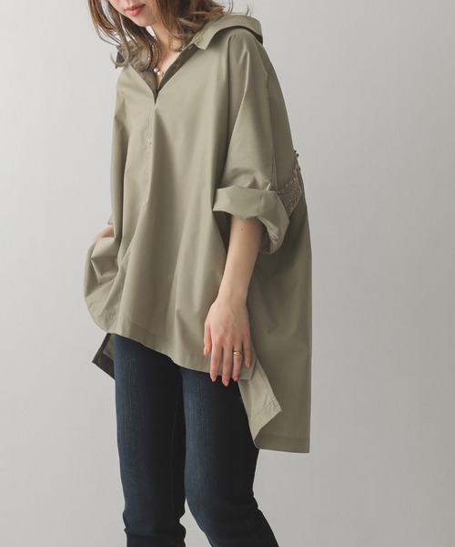 着映するデザイン。 配色のバックレースが目を惹く、抜け感漂う七分袖シャツ。 後ろ姿も抜かりなくおしゃれ。 袖は2段階まで折り返すことができ、そのまま着ても、折り返して雰囲気を変えることもできます。 前ボタンを開けて羽織りにしたり、抜き襟っぽく着たり、シルエットアレンジで印象が変わります。 さらりとした手触りのシャツ生地に、レース×透け感のあるシフォンの組み合わせ。 ゆるっと着れるドルマン袖に、後ろ身頃からバックレースを贅沢にあしらいました。 シアーレースが抜け感漂う軽やかな印象に。 襟ぐりは広めなので、デコルテがすっきり見えます。 この一着でアレンジ自在。 着回し力抜群、≪n'OrLABEL≫配色バックレースドルマンシャツです。