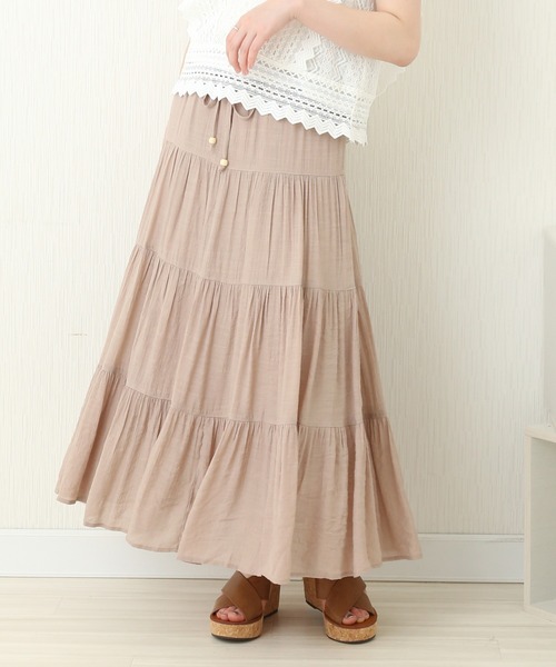 たっぷりと贅沢なボリューム感が動く度に爽やか ボリュームのあるティアードスカート。 軽さと独特な素材感のスラブ生地は リズミカルに揺れるティアードディテールが華やかなアクセントに。 ウエスト部分は共生地リボンで調整可能。 ゴムでストレスフリーな楽ちんでリラックスできます。 シンプルな着こなしになりがちな春と夏にスラブ生地の素材感が目を惹きます。 清涼感があり、通気性も良い為のが特徴です。 これからの季節、ストレスなく快適に過ごす事が出来ます。 シンプルなデザインで、どんなトップスとも◎ コーデも幅広く楽しめる1枚です。 ※屋外の光や照明の当たり具合、パソコンなどの閲覧環境によって実際の色味と異なって見える場合がございます。 予めご了承ください。
