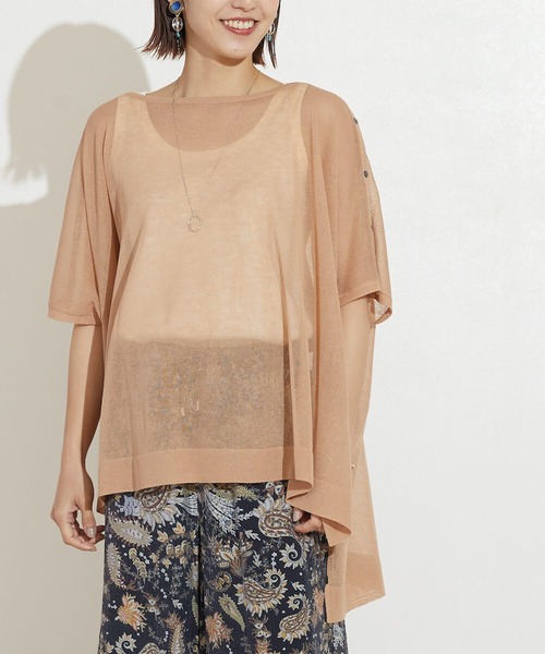 シアー素材が軽やかな印象の、クルーネックニットです。シャリ感のある糸を使用し、涼しげでさらっとした触り心地。 ゆったりとしたオーバーサイズのデザインが、程よいリラックス感をプラス。 広めのクルーネックがデコルテラインを綺麗に見せ、女性らしい印象も◎ キャミソールや、ワンピースなどとのレイヤードスタイルを楽しんでいただけます。 《point》 ・透け感のあるサマーニットです。 ・袖のボタンを外すことで、ノースリーブNTとしても着用していただける2way仕様です。 ・ゆったりしたカジュアルさの中に、さり気ない肌見せ感を演出◎ ※お取扱いにつきましてはご使用前に商品本体に付属しておりますタグの注意事項をご確認くださいませ。 【スタッフ着用コメント】 〔mai〕年齢:30代前半/身長:150cm/体型:細身/普段のサイズ:Sサイズ サイズ感:ゆったりしたサイズ感です。ヒップがすっぽり隠れる着丈と、肘下までの五分袖で安心感があります◎首元はデコルテが丁度見えるくらいです。 素材感:透け感があるので、オーバーサイズですが重たく見えず、軽やかな印象です◎シャリっとしたニットで肌触りもチクチクしないので着やすいです! 着心地:ロングスカートやワンピースと合わせた、リラックススタイルで楽しみたいです! ※モニター・環境等により実際の商品と多少色味が異なって表示される場合がございます。 あらかじめご了承ください。 ■お買いものをよりお楽しみいただくには ◆商品のお気に入り登録 完売カラーの再入荷通知、残り1点の通知、セール等値下げした時の通知も受け取ることができます。 ◆ブランドのお気に入り登録 新商品や再入荷など、いち早くブランドのお得な情報を受け取ることができます。 是非ご活用ください