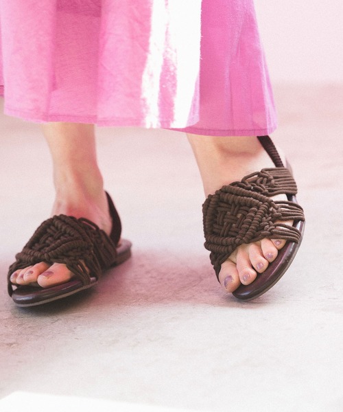 1点ずつ手編みしたマクラメを使用したフラットサンダル。 かかと部分はフェイクスエードのゴム使用になっているので、着脱も簡単で足あたりもソフトです。 インソールに程よいクッション性があるのもうれしいポイント。 ※屋外の光や照明の当たり具合で、実際の商品の色味とカラー別画像の色味や風合いが異なって見える場合がございます。商品の色味はスタジオ撮影の詳細画像にてご確認ください。 ------------------------------------- ≪お買い物をよりお楽しみいただくために≫ ◆商品のお気に入り登録(ハートマークをクリック) 完売カラーの再入荷通知や、完売間近の通知、セールの通知も受けることができます。 ◆ブランドのお気に入り登録 新商品や再入荷など、いち早くブランドのお得な情報を受け取ることができます。 -------------------------------------