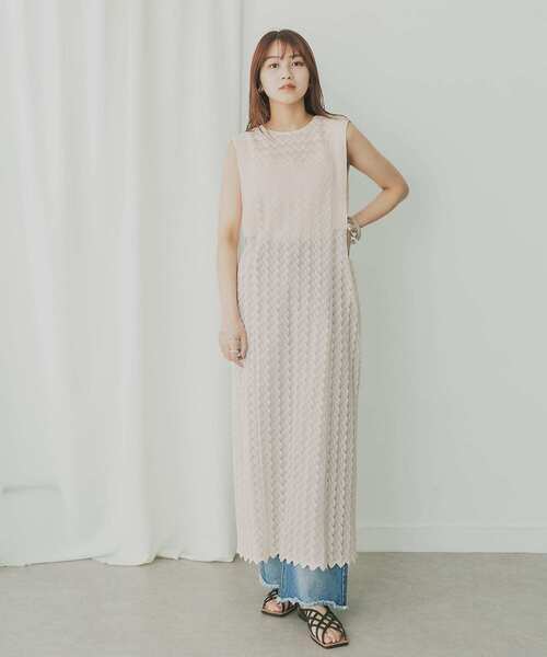 【レースデザインで差をつけた、真夏まで着回せる大人顔ワンピース】 貝殻のような柄のレースで仕上げたワンピース。素材感を活かすためシンプルなストレートシルエットを採用して大人っぽい雰囲気を纏わせました。肩にニットテープ、胸元に切り替えを施してさりげなくアクセントをプラス。キャミソールタイプのペチコートが付いているので1枚着でもお楽しみいただけます。 POINT ・貝殻のような柄のレースで存在感アップ ・大人っぽさを引き立てるストレートシルエット ・1枚着しやすいキャミソールタイプのペチコート付き COORDINATE カジュアルに仕上げたい時はデニムとのレイヤードがおすすめ。ミニバッグやパンプスを合わせるとお呼ばれ時に重宝します。同素材のKBF+ パターンレースパンツ(KP15-24N170)とのセットアップに挑戦しても◎ ※この商品は、デリケートなレース素材を使用しています。表面の粗いものやバッグ、ベルト、先の鋭いもの等との摩擦や引っ掛かりがあると、ささくれや糸浮き、糸切れなどが起こることがあります。クリーニング処理の際は、引っ掛かりを防ぐためネットをご使用ください。 ※保管する際は、ハンガーにかけ、ゆったりとスペースをとって吊るしてください。高温多湿の場所で長期間保管すると他の衣類に色移りすることがありますのでご注意ください。 [ペチコート] one : 肩幅24cm / 総丈95cm / 前身頃80.5cm / 後身頃77cm / 身幅46cm / スリット9.5cm ※商品画像は、光の当たり具合やパソコンなどの閲覧環境により、実際の色味と異なって見える場合がございます。予めご了承ください。 ※商品の色味の目安は、商品単体の画像をご参照ください。 ----------------------------- 透け感:なし 伸縮性:ややあり 裏地:なし 光沢:なし ポケット:なし -----------------------------