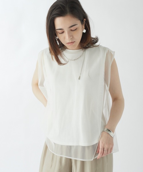 ふんわりとしたチュールが、シンプルな中に大人の華やかさをプラスしてくれるノースリーブトップス。 フェミニンなイメージのチュールも、ミニマルシルエットに仕上げることで甘くなりすぎずデイリーに着やすい1着に。 ベースはコットン100%のカットソー素材なので、肌触りも快適。 内側のカットソーだけボトムにインしたスタイルも今年らしくオススメ。 1枚着の増える暑い季節に映える、夏イチオシの1着です。 ・・・・・・・ 透け感:あり(チュール) 裏地:なし 伸縮性:あり(本体) 生地の厚さ:やや薄手 ケア方法:手洗い・ドライクリーニング ・・・・・・・ ※商品画像はサンプルのため、色味やサイズ等の仕様に変更がある場合がございますので、予めご了承ください。
