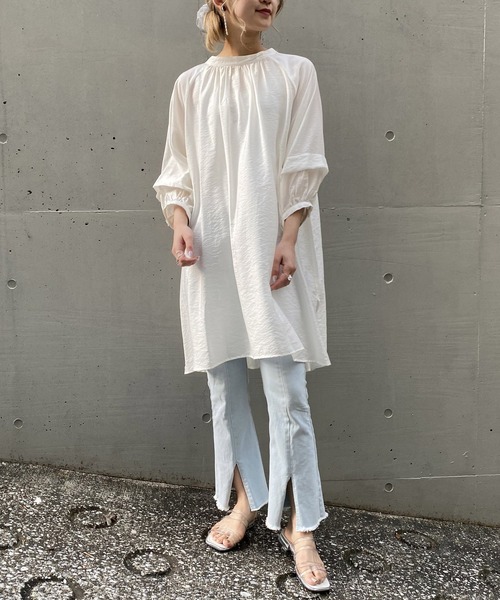 人気のボリューム袖がポイント☆2wayで着まわせるチュニック風をまとったふんわりシルエットが人気のチュニックは、贅沢なたっぷりのタックで顔まわりもすっきりと小顔効果が嬉しい◎柔らかなナイロンレーヨン素材なので、前を開けてさっと羽織りとしても使えます。ボタンを閉じて、前後どちらを前にしても◎大人可愛いスタイリングが決まる万能な1枚です。※着用画像の付け襟は別売りになります。♪商品のお気に入り登録お気に入り登録した商品は、ラスト1点になった時、完売商品の再入荷、セールになった時にお知らせします。♪ブランドのお気に入り登録新商品の発売、再入荷、セール情報など、ブランドのお得な情報を受け取ることができます。