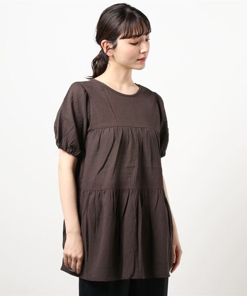 気分に合わせて着こなしを楽しめる、前後どちらでも着用可能なブラウス。ふわっとしたティアードデザインが今季らしいムードを高めてくれる1枚です。ボリュームのある袖も女性らしいラインをメイク。長めの着丈で取り入れやすく、トレンド感たっぷりのコーデが完成します。