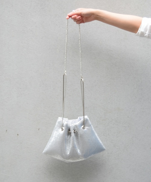 ◆アイテム詳細◆ 人気の"Metalic Bag" シリーズの新しいデザイン。 ショルダーバッグにも使える2way bag。 巾着型でメッシュ状のメタッリク素材がこなれた感じで、 コーデを引き立たせてくれるアイテムです。 フォーマルウェアなどにも使いやすい一点です。 内側にはポケットが付いております。 ーーーーーーーーーーーーーーーーーーーーーーー 【COLOR】シルバー・ピンクゴールド・ブラック 平置き(㎝) タテ 20 ヨコ 30 マチ 2 【素材】本体 メタル チェーン部分 メタル 裏地 ポリエステル 100%
