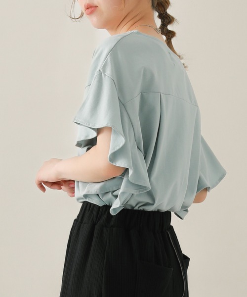 ■デザイン 袖から裾にかけてフリルをあしらった、コーディネートのポイントになるTシャツ。可愛くなり過ぎないように計算されたフリル感と、切り替えライン&脇のマチで大人っぽく贅沢な雰囲気に仕上げました。ふわっと腕にかかる袖が、涼し気な印象です。 ■素材 さらりとした肌触りの良い、コットン100%の生地です。程良く厚みがあり、快適な着心地です。 ■コーディネート シンプルなデザインで着回しやすく、パンツやスカートにさらっと合わせるだけでコーディネートが完成します。サイドのフリルがアクセントになった、お洒落な着こなしに。サロペットなどのインに合わせても、さり気ないフリル使いが映えます。