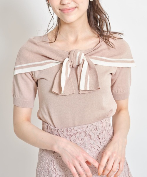 いつでも今っぽく女らしく♪配色ライン入りオフショル風ボウタイニットプルオーバー 色使いが大人っぽいフェミニンなニットプルオーバー。 ヘルシーに色っぽいオフショル風デザインと 組み合わせたボウタイが大人レディなアクセント♪ 配色ラインでトレンド感のある洒落感をON★ 今っぽい女性らしさを引き立て、品のある着こなしに。 ボトムにINしてもOUTしても可愛く決まる 絶妙な丈感で様々なスタイリングに合わせやすい1着です。