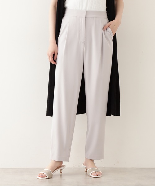 しなやかな落ち感のある上品なポリエルテルオックス生地を使用したペグパンツ。ウエストのタックは中縫いされていて、おなか周りがきれいにすっきり見えるデザイン。シンプルで美しいペグシルエットは、トップスを選ばず合わせやすい便利で汎用性のあるパンツです。※モデルの着用画像の場合、光の当たり具合により、実際の色味と異なって見えることがございます。色味は、商品単体の画像をご参照ください。