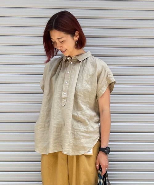 D.M.G / ディーエムジー S/Sレギュラーカラーシャツリネン素材の涼しげな半袖シャツ。襟周りのギャザーやフレンチスリーブがポイント。さらりと清々しい着心地のシャツです。[D.M.G / ディーエムジー]厳しい品質管理のもと国産デニムを使い、児島・さぬき市の国産工場で縫製しています。児島の洗い工場で加工を施した製品は肌馴染みの良い生地感に仕上がり、はき込むほどに独特の風合いを生み、長く味わっていただける商品となります。「デニム」・「ワーク」・「ミリタリー」といったカジュアル服の普遍的なキーワードをイメージソースに、ベーシックでありながら程良く時代と寄り添ったデイリーウェアーを提案します。