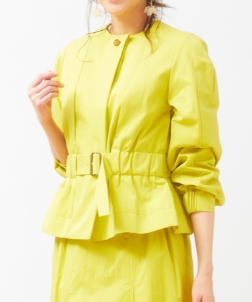 羽織るだけでさまになる、ギャバジンを使用したノーカラーブルゾン。 フロントや袖など切り替えを入れることで、立体感のあるシルエットに仕上げました。 ショート丈なので腰回りはすっきりと、トレンドのハイウエストボトムとも相性抜群。 同素材を使用したスカート(35360870018)と合わせてセットアップで着こなすのもオススメです。