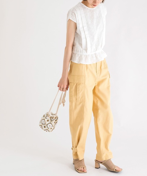 【女性らしいディテールを取り入れたカーゴパンツが登場】軍物のパンツの形やディティールを採用したメンズライクな1着。あえて淡いカラーを取り入れることで女性らしさをプラスしました。裾のボタンでシルエットを変えられるのでスタイリングの幅も広がるのが嬉しいポイント。POINT・軍物のディティールを取り入れたデザイン・女性らしいカラー展開・ロングシーズンお使いいただける素材感COORDINATEフリルブラウスなど、あえて女性らしいトップスを合わせたMIXスタイルが可愛くておすすめ。BIGTEEを合わせたとことんメンズライクなコーデもおすすめです。※直射日光や照明が当たるところに長時間置かれると日焼けや変色することがありますので、ご注意ください。※商品画像は、光の当たり具合やパソコンなどの閲覧環境により、実際の色味と異なって見える場合がございます。予めご了承ください。※商品の色味の目安は、商品単体の画像をご参照ください。-----------------------------透け感:なし伸縮性:なし裏地:なし光沢:なしポケット:あり-----------------------------
