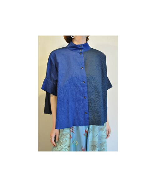 たっぷりフレアが特徴的なブラウス。 ハイネック型で、左右が配色になっています。 ちりめんのような独特な風合いのコットン素材で、涼しいアイテムです。