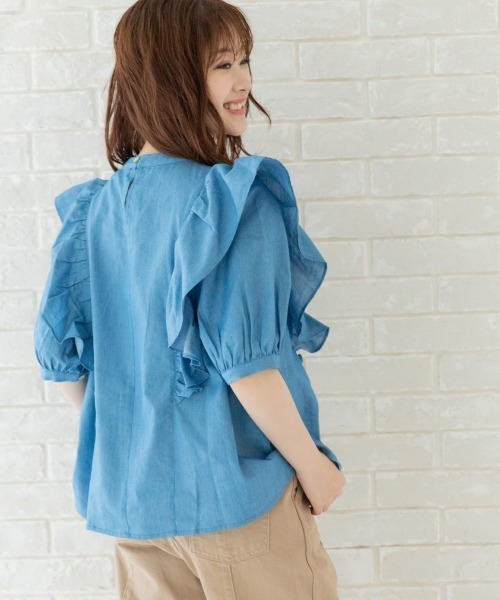 デニムの魔法で甘さ控えめ。コーデがしやすいガーリーフリルブラウス <MATERIAL>軽やかさを感じるオールシーズン大活躍な使いやすいデニム生地です。 流行のピンタック使用と胸元のフリルがデザインポイント◎ デニムならではのタフな素材感にも注目です。 <DESIGN> シルエットやデザインは甘めですが、素材がデニムになるだけで大人っぽくカジュアルな印象も。 1枚でもコーデの主役になれちゃうドラマティックなブラウスです。 今シーズン人気のあるつけ襟やメロートップスを重ねてガーリーを堪能するコーデもかわいいので是非お試しください。 裾に向かって広がるデザインなので風通りよく見た目とは裏腹に涼やかに着用できます。 シンプルに同系色デニムを合わせてセットアップやワンピース風に着こなしても、カラーパンツやリブパンツ、チュールスカートを合わせてもキュートです。 <COLOR> ブルーの方がサックスより少し青が強めのカラーになっております。 デニム:パフスリーブ:ボリュームスリーブ:ワイドシルエット:エイジレス:エフォートレス デート:オーバーサイズ:ナチュラル:青:ブルー 体型カバー:着やせ:高見え:レトロ:スモック:5分袖 <CARE> ※詳しくは製品に付属している洗濯表示をご参照ください。 ※撮影環境により、多少実際のカラーと異なる場合がございます。 また、携帯やスマートフォン、パソコンなどの画面上と実物では多少色が異なって見える場合がございます。